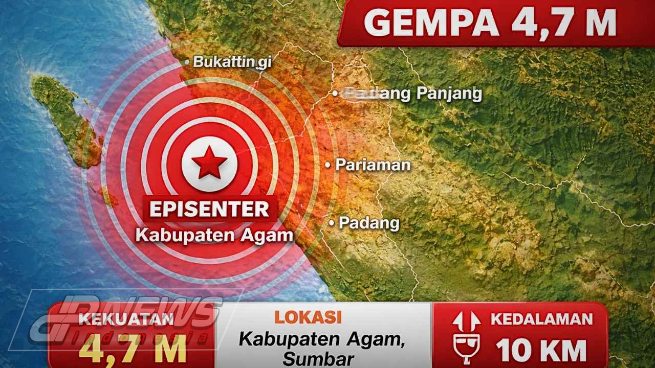 Dpnews Indonesia || Agam – Gempa bumi tektonik bermagnitudo (M) 4,7 mengguncang wilayah Kabupaten Agam, Sumatera Barat, Minggu pagi (28/12/2025) pukul 09.15 WIB.