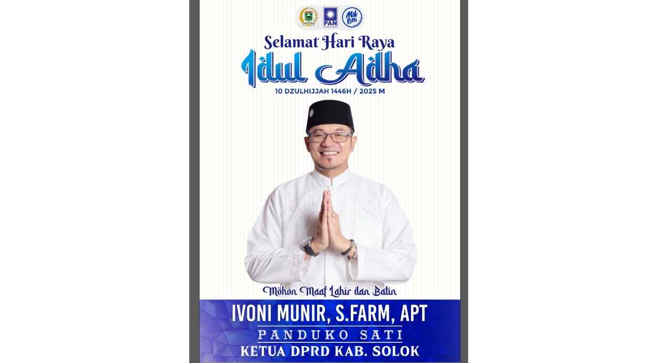 Dpnews Indonesia || Solok – Ketua Dewan Perwakilan Rakyat Daerah (DPRD) Kabupaten Solok, Provinsi Sumatera Barat, Ivoni Munir, S.Farm., Apt., yang juga bergelar adat Panduko Sati, menyampaikan ucapan selamat Hari Raya Idul Adha 1446 H / 2026 M kepada seluruh masyarakat Kabupaten Solok dan umat Muslim di manapun berada.