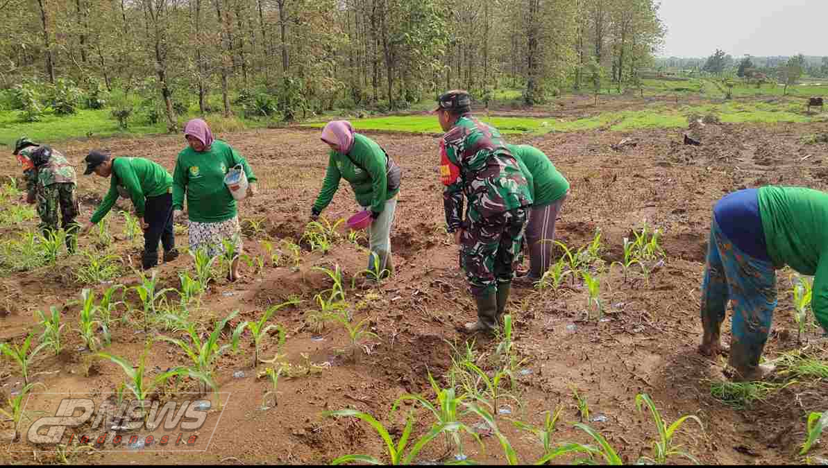 Dpnews Indonesia || Majalengka – Serka Nano Babinsa Koramil 1715/Kertajati Kodim 0617/Majalengka, memberikan dukungan kepada petani yang sedang menanam jagung di Desa Sahbandar, Kecamatan Kertajati, Kabupaten Majalengka, pada Selasa (16/1/2024).